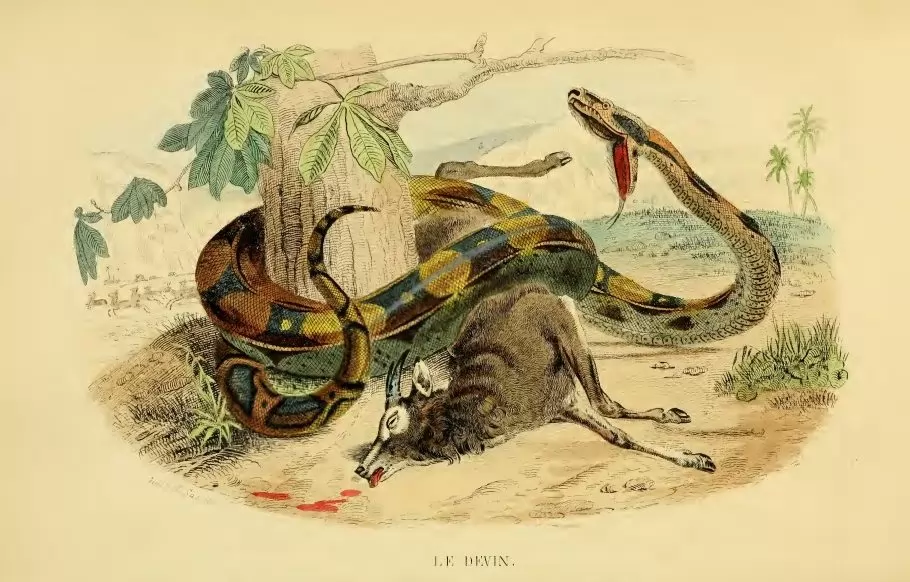 Furthermore, Boa species were reported from other West Indian Islands. Historical evidence from naturalists described a large snake inhabiting Martinique (the island between Saint Lucia and Dominica) . Breuil suggests that this species must have been a member of the genus Boa, however without providing further evidence other than the description of the naturalist Labat from 1724. Breuil claims that it became extinct from this island in the more distant past, since naturalists after Labat, describing the snakes from the island did not report or collect any specimens of this boa .